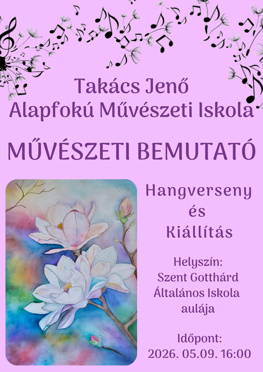 Művészeti bemutató Post author:itpluszkft Post published:2026-04-27 Post category:Hírek Szeretettel várunk minden érdeklődőt iskolánk Művészeti bemutatójára. Fellépnek: Rábavölgyi vonószenekar, Ifjúsági Fúvósegyüttes, Ifjúsági Énekegyüttes, a magánének és a zeneismeret tanszak növendékei. You Might Also Like Nyárköszöntő hangverseny 2023-06-15 Hangversenysorozat 2025-02-06 Lépcsőgaléria 2024-12-18