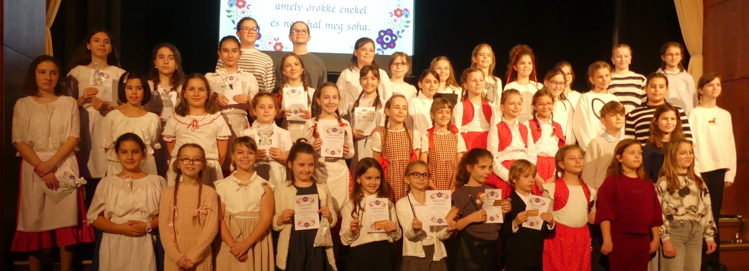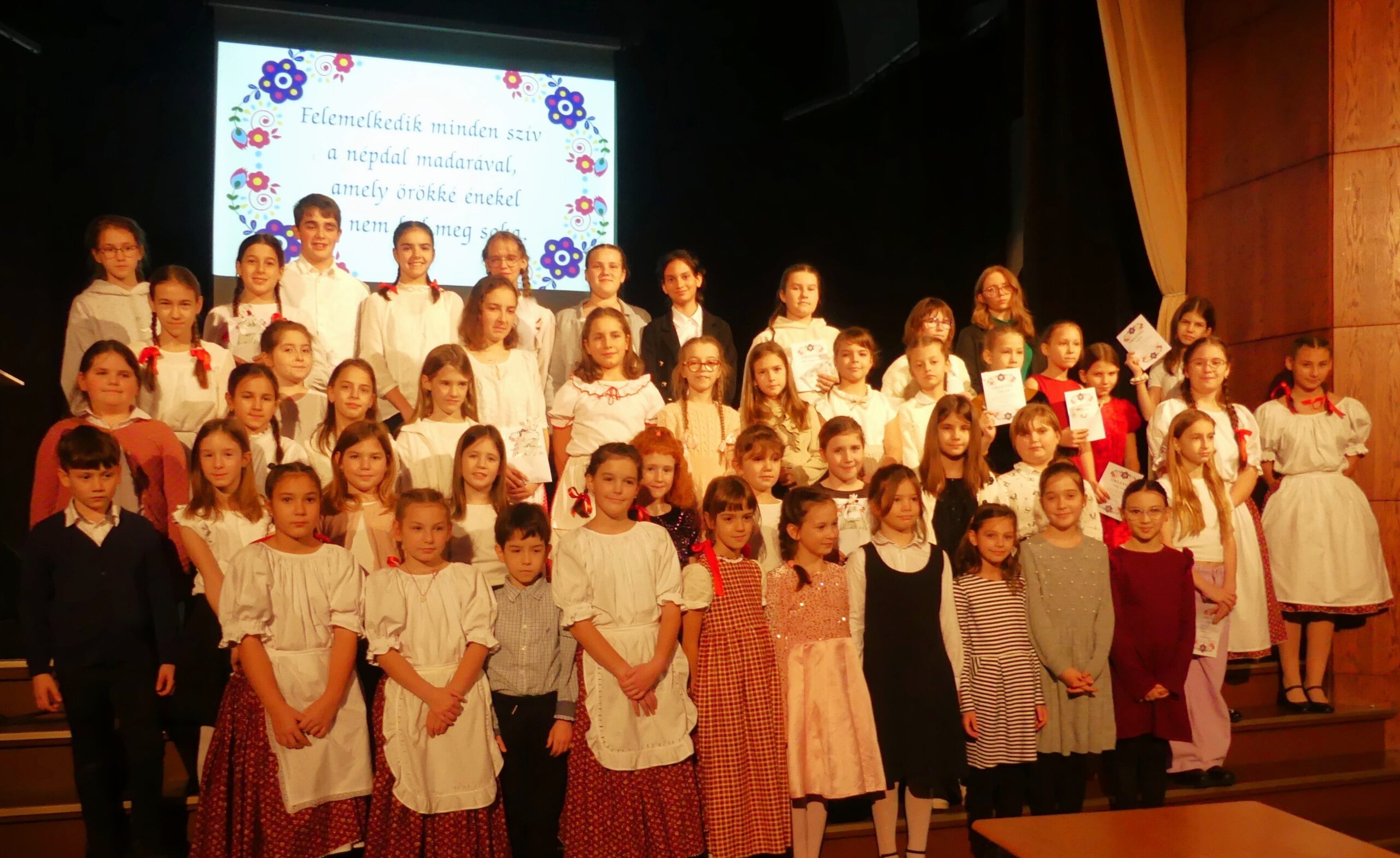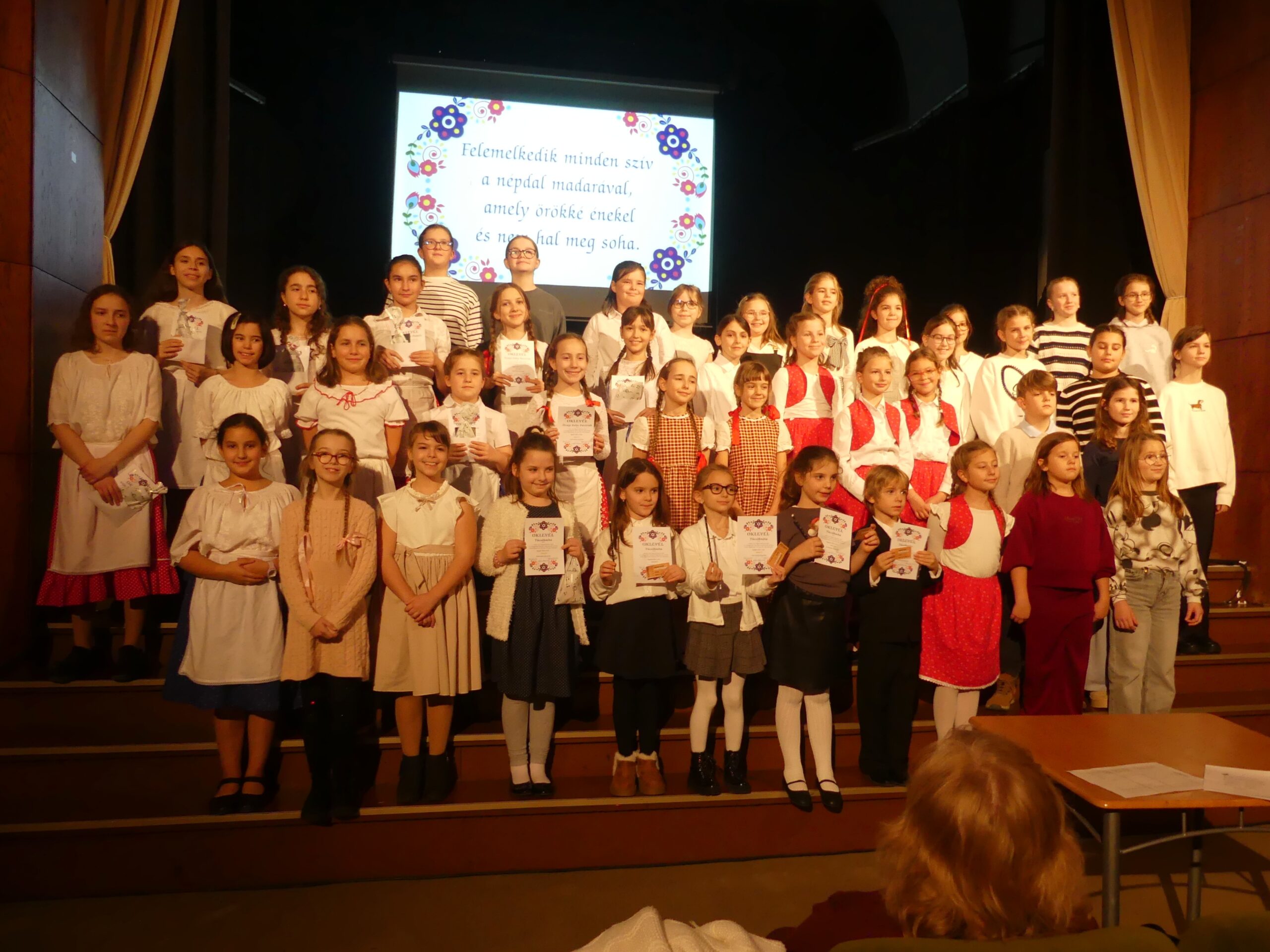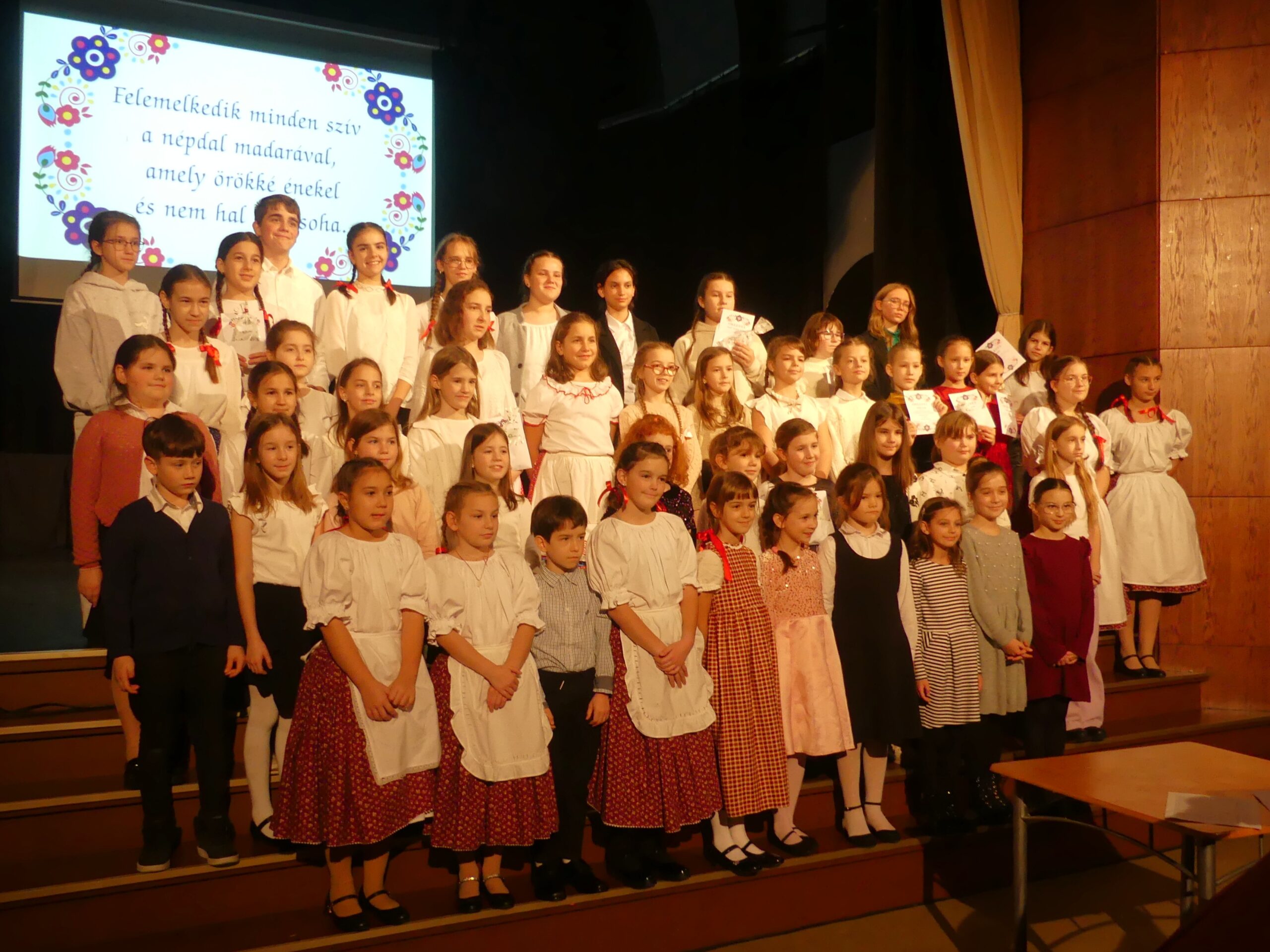 Novemberben 27-én került megrendezésre körzeti népdaléneklési versenyünk, melyre szép számmal érkeztek versenyzők a szentgotthárdi, magyarlak-csörötneki, őriszentpéteri, bajánsenyei, apátistvánfalvai és pártosfalvi iskolákból. A nagy érdeklődésre való tekintettel a verseny a Színházban került megrendezésre. Egyéni, kis-és nagycsoportos kategóriában egyaránt hallhattunk produkciókat. A három tagú zsűri minden produkciót arany, ezüst vagy bronz minősítéssel jutalmazott, egy tanuló pedig kiemelt arany minősítést kapott. A verseny szünetében a szülői közösségünk jóvoltából vendégül láthattuk a versenyzőket és tanáraikat. Jó hangulatú, színvonalas versenyt zártunk.