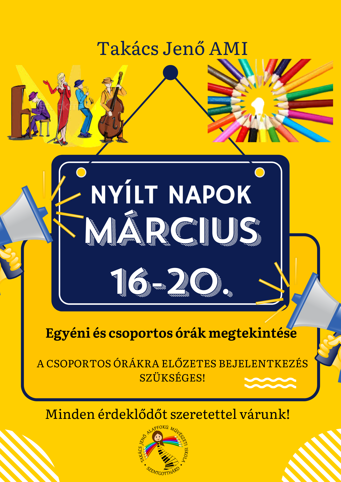Szeretettel várunk minden Szülőt a Takács Jenő Alapfokú Művészeti Iskola képző- és zeneművészeti tagozatának nyílt napjaira 2026. március 16-20-ig.