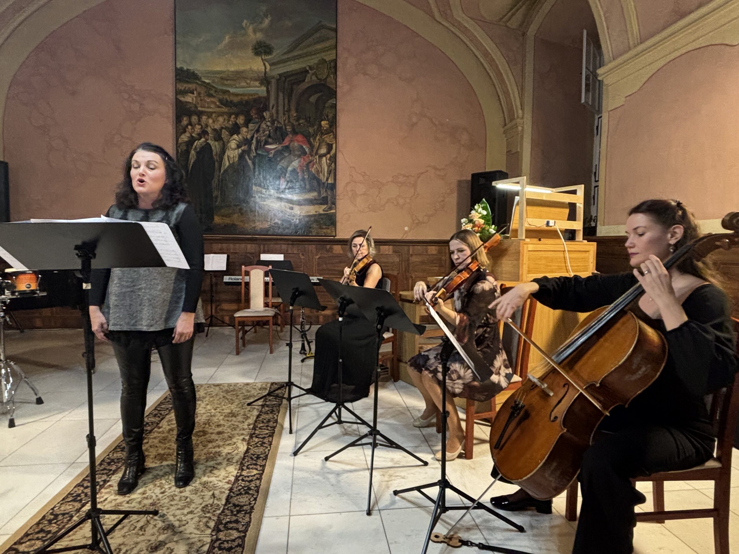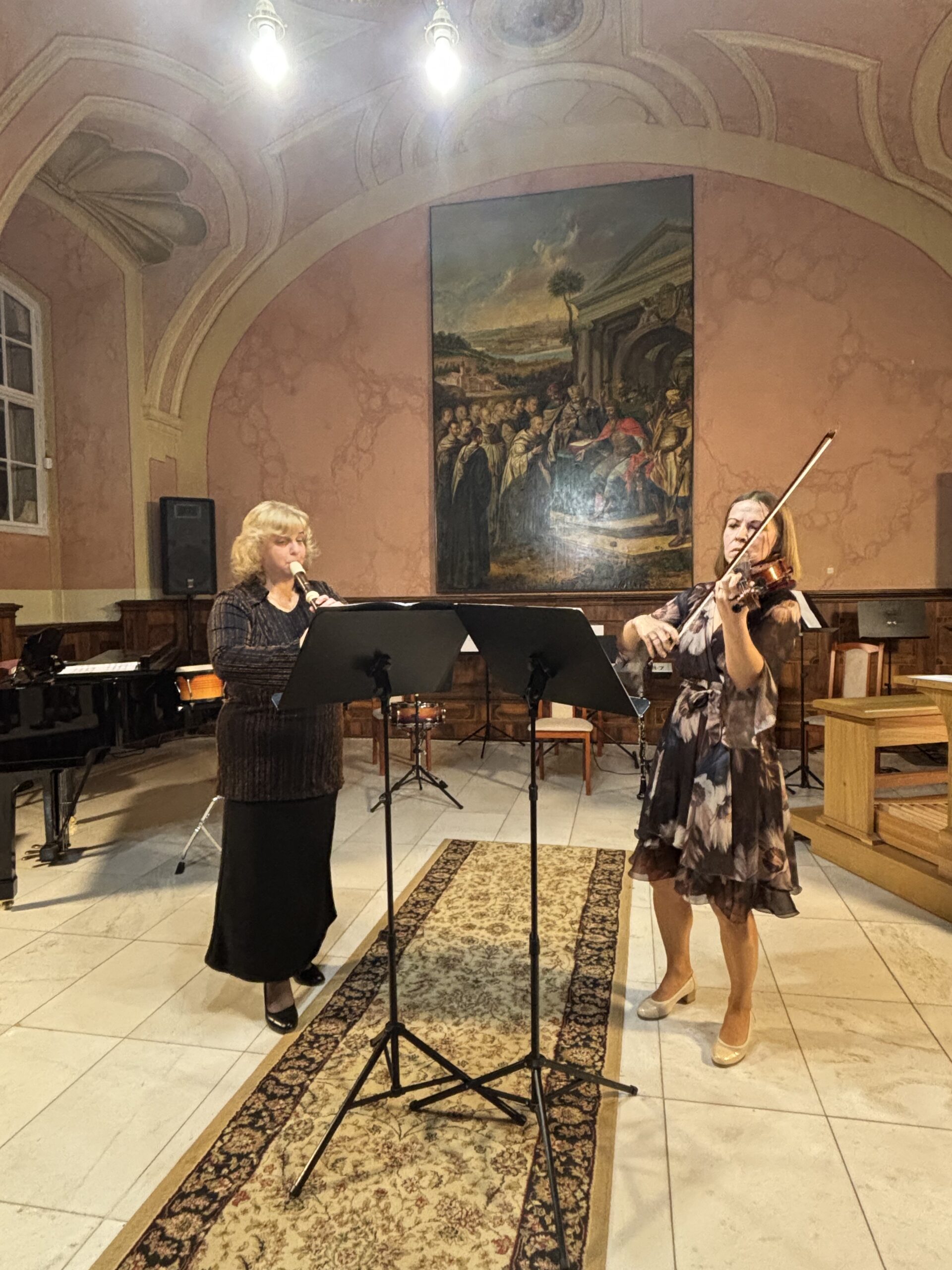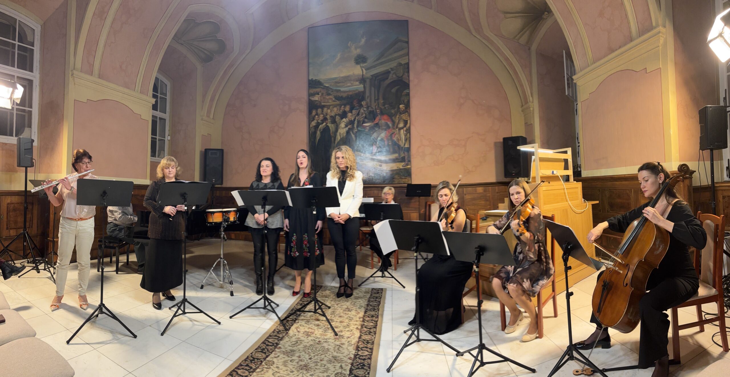 A koncertet a Tanári kórus nyitotta Sárváry László két művével, Az óceán hangjai és a játékos Züm-züm című darabokkal. A hangulatot a sokszínű hangszer-összeállítások és műfajok is gazdagították: barokk furulya–hegedű duó Valentine műveiben, majd Frescobaldi dallamos vokális kompozíciója hegedű- és gordonkakísérettel.