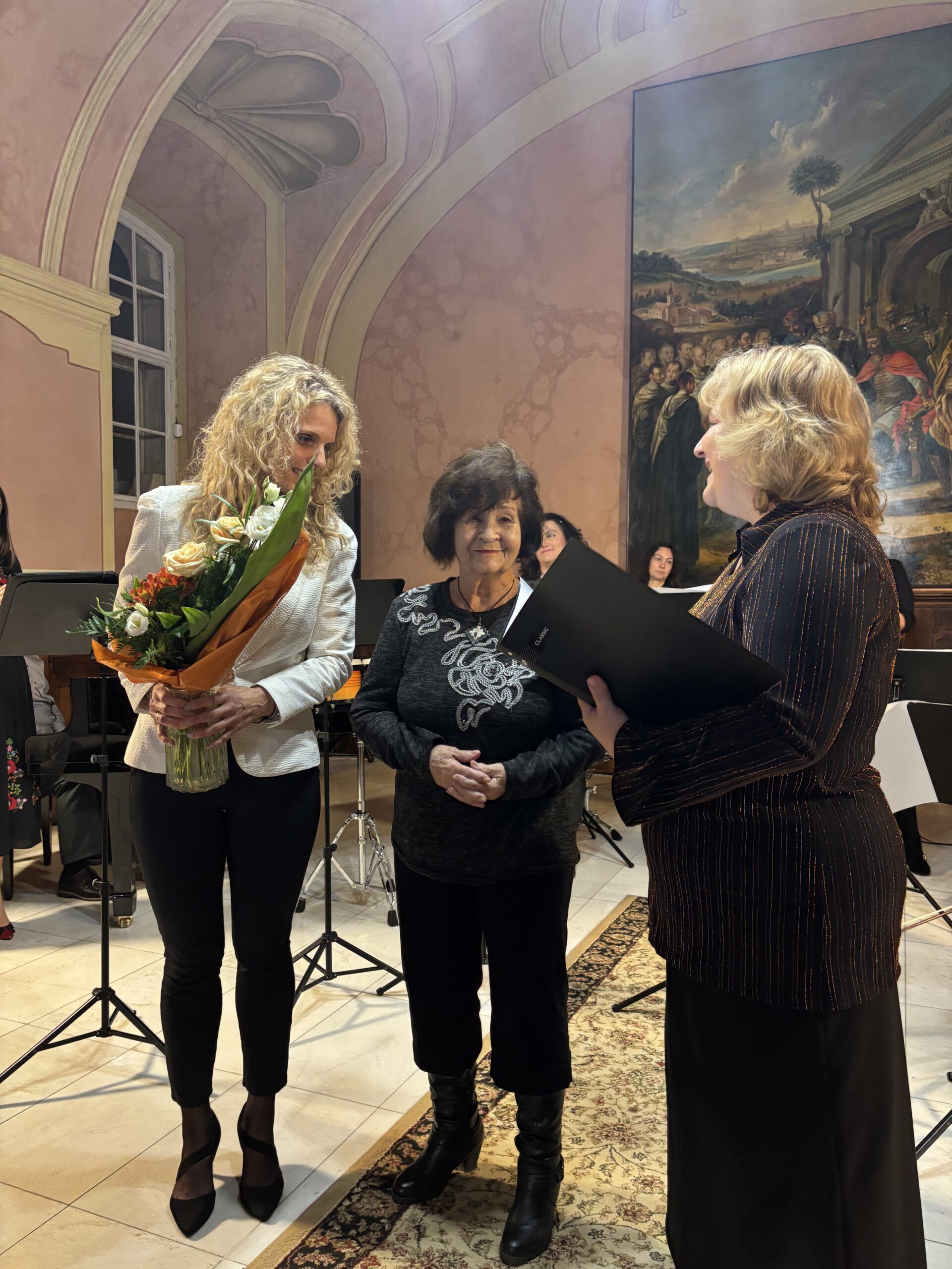 Zárásként ismét a Tanári kórus lépett színpadra. Brahms meghitt Bölcsődala után, az utolsó műsorszám előtt 90. születésnapja alkalmából köszöntöttük Szabó Elekné Csider Bernadettet, iskolánk nyugdíjas igazgatónőjét, aki hosszú éveken át meghatározó alakja volt az intézmény életének.
